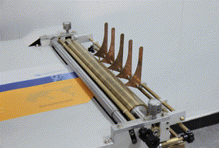 | 蝴蝶裝對(duì)裱演示 在書(shū)殼機(jī)旁配個(gè)簡(jiǎn)易裝置就可以完成A3尺寸精裝書(shū)殼的封面上膠、紙張和紙板裱糊等蝴蝶裝對(duì)裱工作。 |